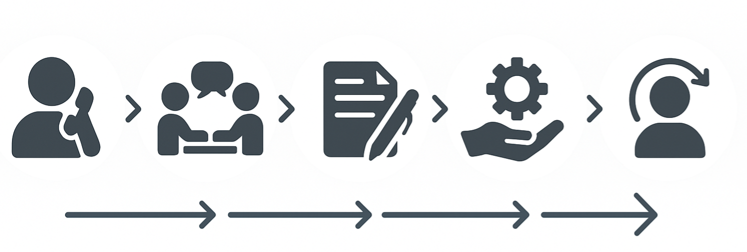 We believe in keeping things clear and simple. Here’s how we work together from the first contact to ongoing support, so you always know what to expect.